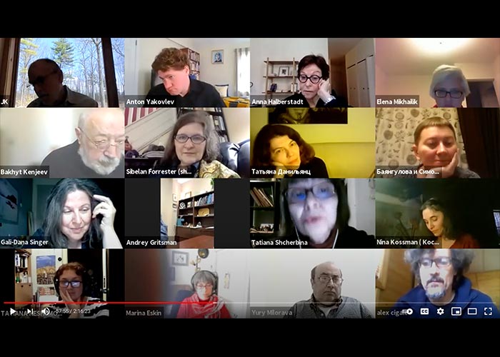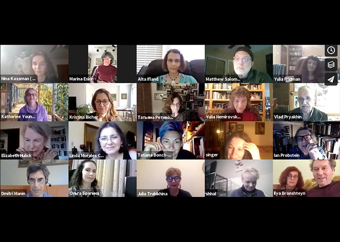 Participants (in alphabetical order): Elena Berezetsky (San Diego),Kristina Andersson Bicher, Tatiana Bonch (Sydney, Australia), Ольга Брагина (Kiev), Ilya Bronshteyn (New York), Linda Morales Caballero (New York), Юля Фридман (Moscow), Marina Eskin (Boston), Anna Halberstadt (New York), Elizabeth Hulick (New York), Alta Ifland (San Francisco), Nina Kossman (New York), Дмитрий Манин (California), Julia Nemirovskaya (Oregon), Ian Probstein (New York), Vlad Pryakhin (Russia), Susan Reynolds (Oxford, UK),Gali-Dana Singer (Jerusalem), E.V. Svetova (New York), Julia Trubikhina Kunina (New York), Tatiana Retivov (Kiev), Katherine Young (Virginia).